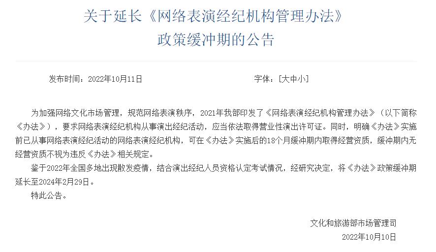 原標題:文旅部:延長《網(wǎng)絡(luò)表演經(jīng)紀機構(gòu)管理辦法》政策緩沖期