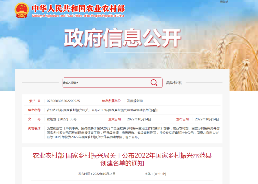 農(nóng)業(yè)農(nóng)村部、國(guó)家鄉(xiāng)村振興局開(kāi)展的國(guó)家鄉(xiāng)村振興示范縣創(chuàng)建申報(bào)評(píng)審工作近日完成,北京市大興區(qū)、河南省蘭考縣、四川省眉山市東坡區(qū)等100個(gè)單位為2022年國(guó)家鄉(xiāng)村振興示范縣。其中甘肅省會(huì)寧縣、民勤縣、臨澤縣三地上榜。