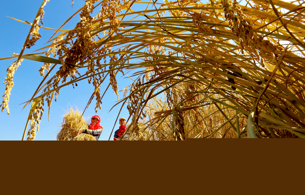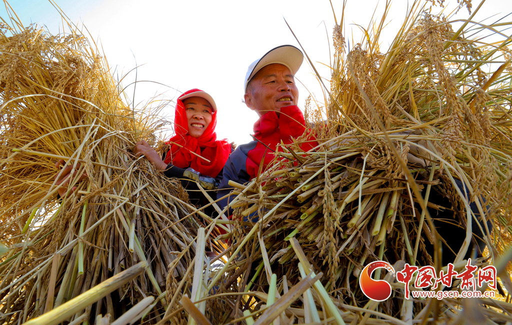 10月21日,位于祁連山下的甘肅省張掖市甘州區(qū)烏江鎮(zhèn)新河田園綜合體內(nèi),農(nóng)戶們正在收割成熟的高原水稻。