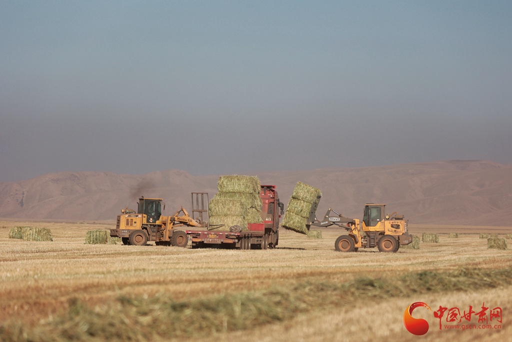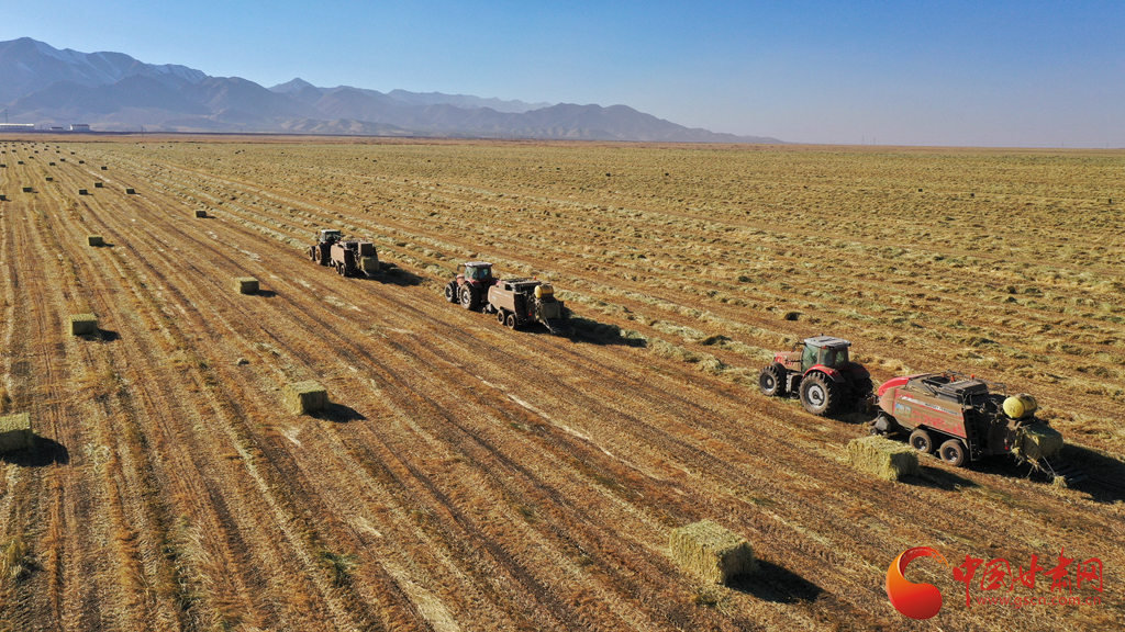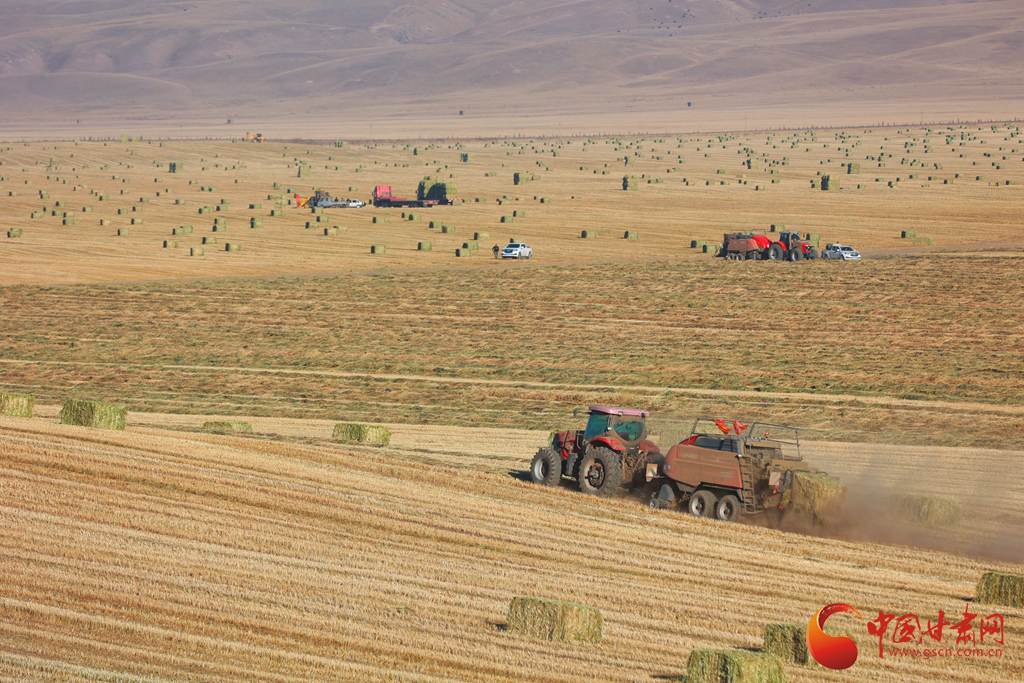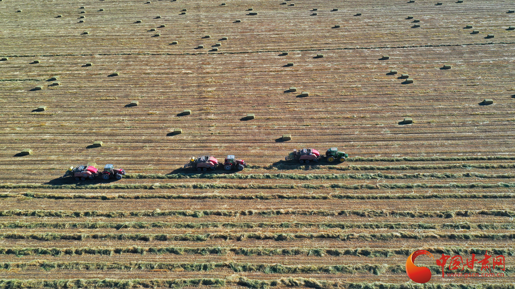 11月9日,甘肅山丹馬場正在對此前收割晾曬的21萬畝燕麥草打包運(yùn)輸,一輛輛大型農(nóng)用機(jī)械穿梭田間忙碌作業(yè)。
