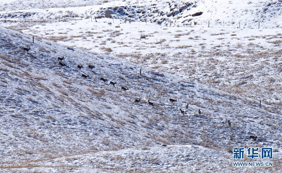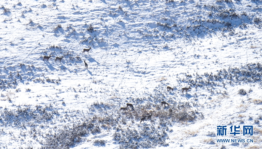11月12日,一場(chǎng)降雪過(guò)后,祁連山國(guó)家公園甘肅省張掖市民樂(lè)縣境內(nèi)被一層薄薄的白雪覆蓋,成群的野生狍鹿漫步在積雪覆蓋的山坡上。它們時(shí)而追逐玩耍,時(shí)而靜臥休息,時(shí)而覓食充饑,展現(xiàn)出一幅人與自然界和諧共生的畫(huà)面。