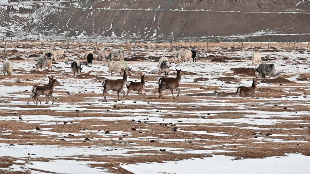 近日,在武威市天祝藏族自治縣抓喜秀龍草原上,野生的狍鹿和牧民家養(yǎng)的白牦牛同食牧草,構(gòu)成一幅和諧動人的自然圖景。張廷愛攝。