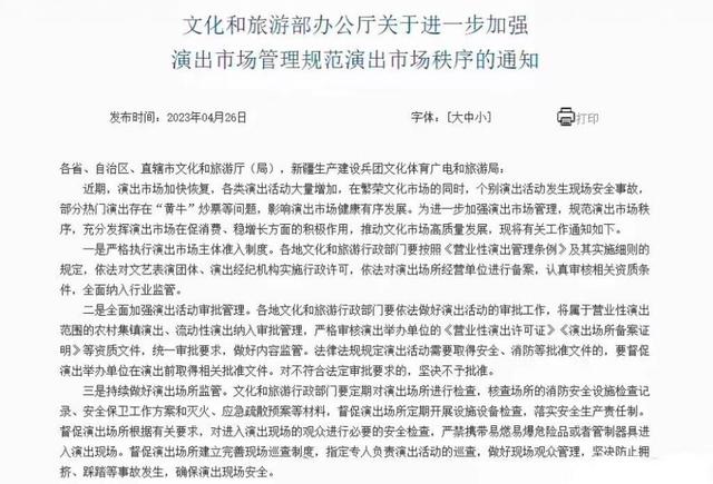 近日,文旅部辦公廳發(fā)布《文化和旅游部辦公廳關(guān)于進一步加強演出市場管理規(guī)范演出市場秩序的通知》。通知提到,對臨時搭建舞臺、看臺的演唱會、音樂節(jié)等大型演出活動,文化和旅游行政部門要做好演出現(xiàn)場監(jiān)管,查驗演出舉辦單位的演出批準文件及相關(guān)手續(xù),核驗演員信息及演出節(jié)目內(nèi)容,嚴禁擅自變更演員及演出內(nèi)容,嚴禁假唱、假演奏等違法違規(guī)行為。