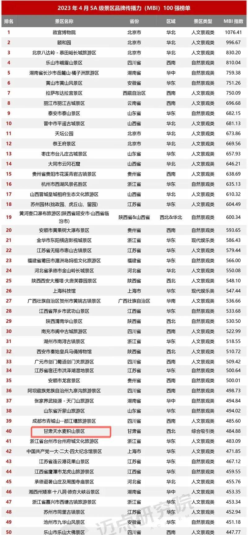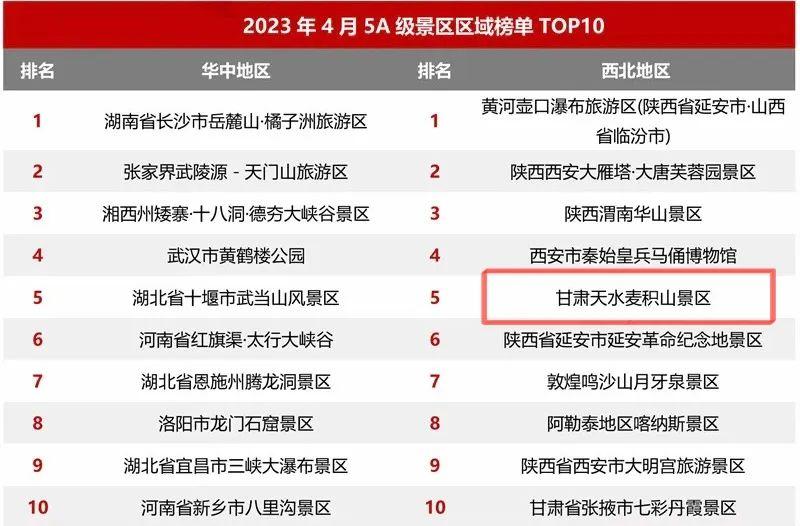 2023年4月5A級景區(qū)品牌傳播力100強榜單上,熱烈祝賀麥積山景區(qū)榮登國內文旅行業(yè)最具影響力的權威數(shù)據分析機構“邁點研究院”4月5A級旅游景區(qū)品牌傳播力百強榜單前五十和綜合類旅游景區(qū)第一、西北地區(qū)分項榜單第五。