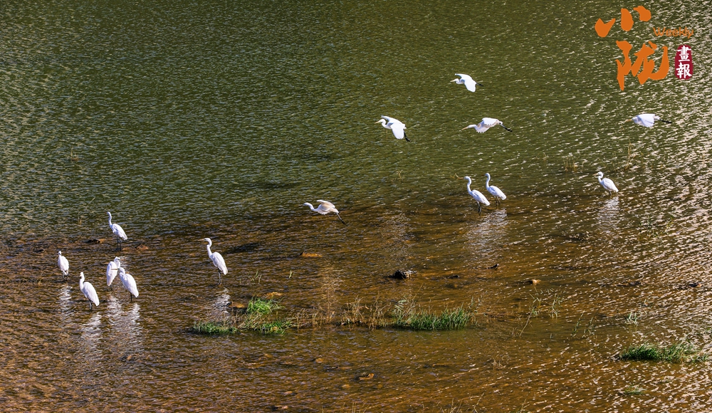 天藍(lán)、水清、田綠、樹(shù)青,成群的白鷺在子午嶺上方自由飛翔,時(shí)而在水面或河岸追逐嬉戲。