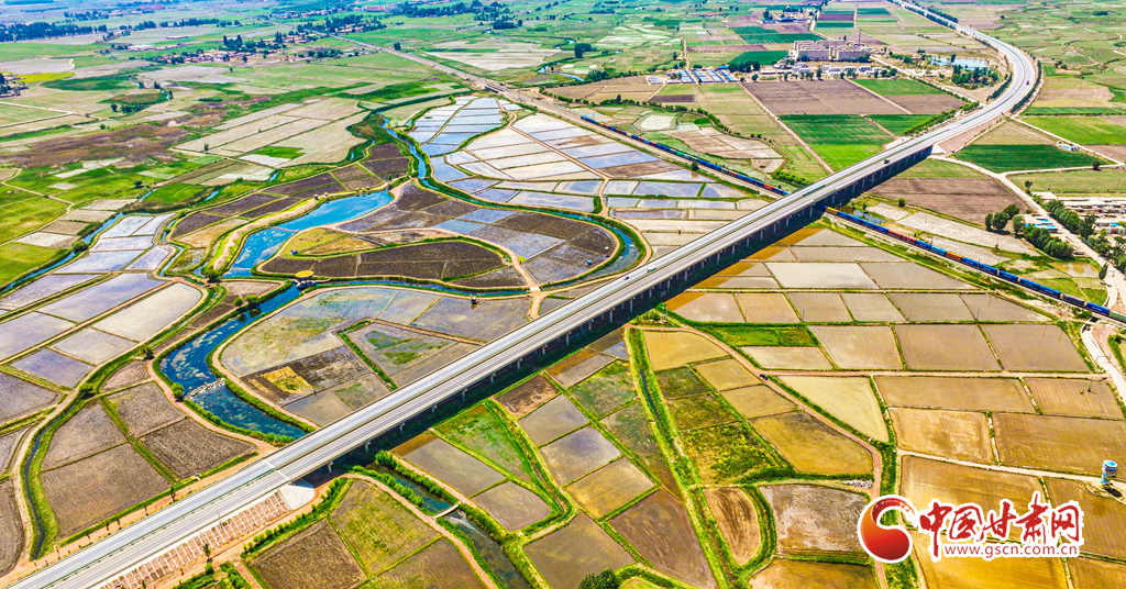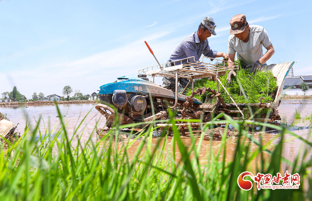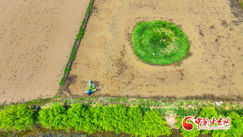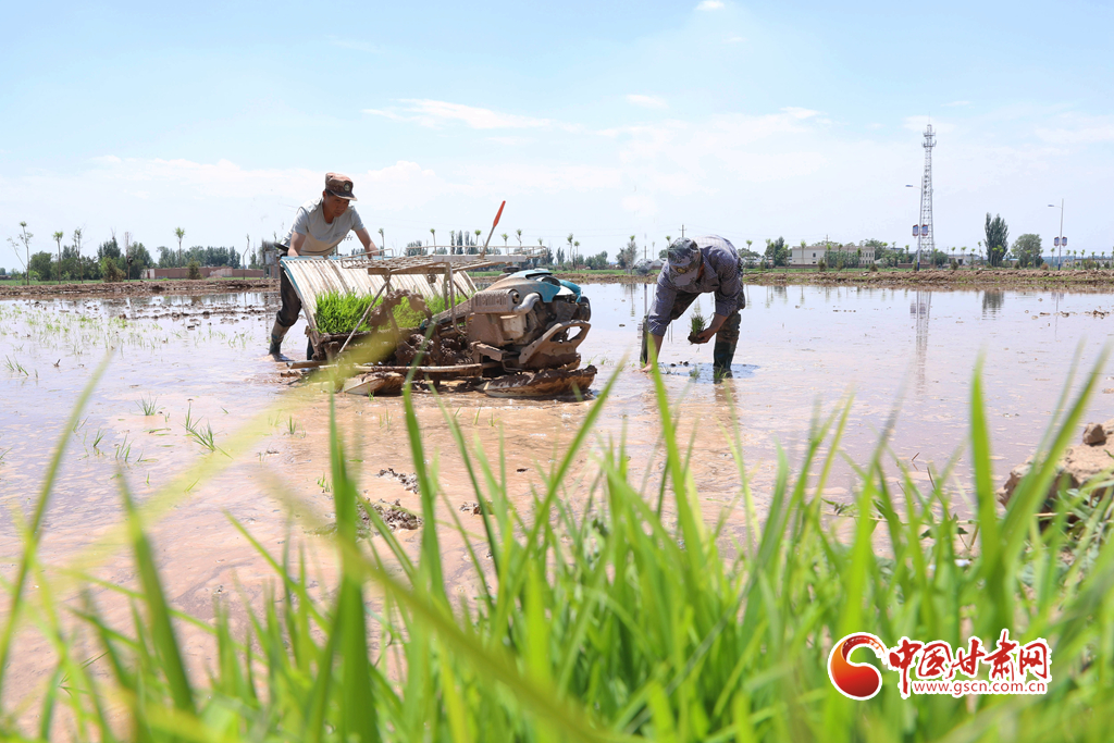 6月5日,祁連山北麓,甘肅省張掖市甘州區(qū)烏江鎮(zhèn)、靖安鄉(xiāng)的稻田里,插秧機同農(nóng)戶來回穿梭插秧,2200多畝稻田進入了繁忙插播中。