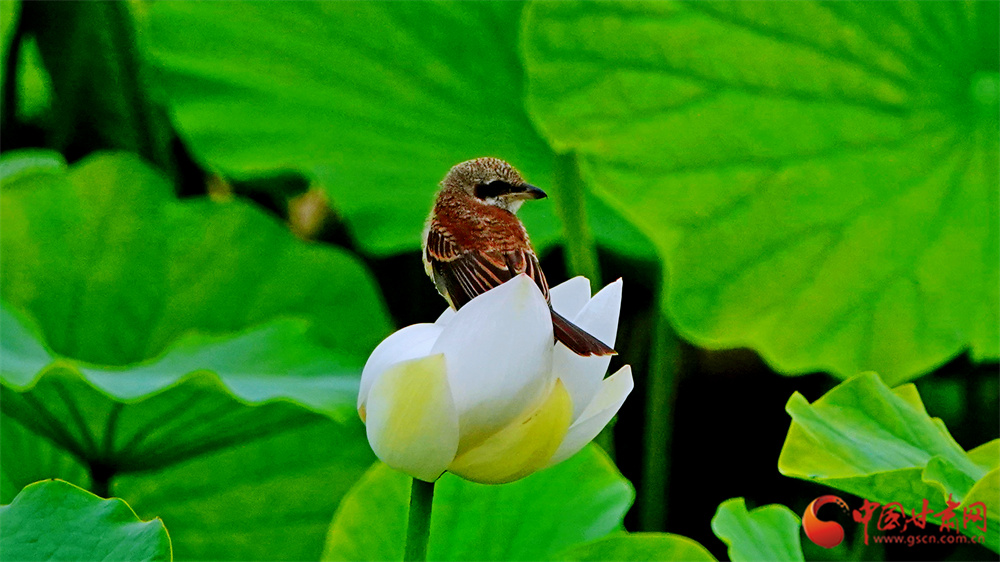麻雀站立荷花枝頭
