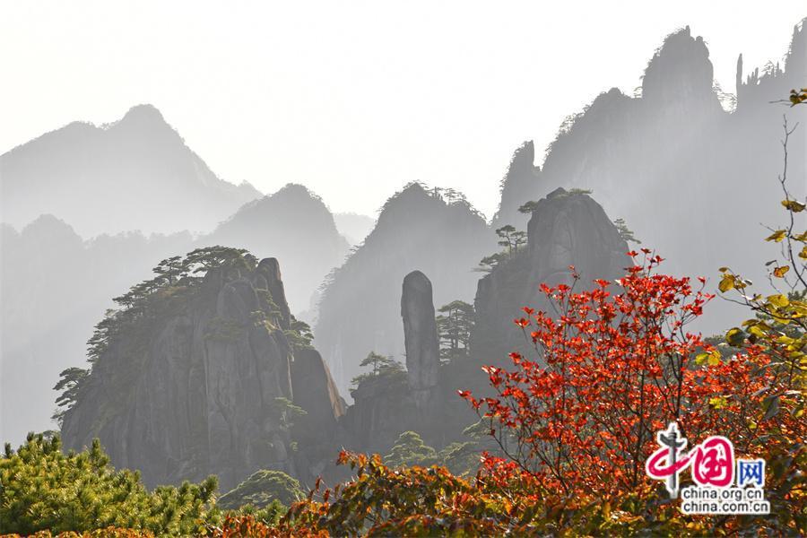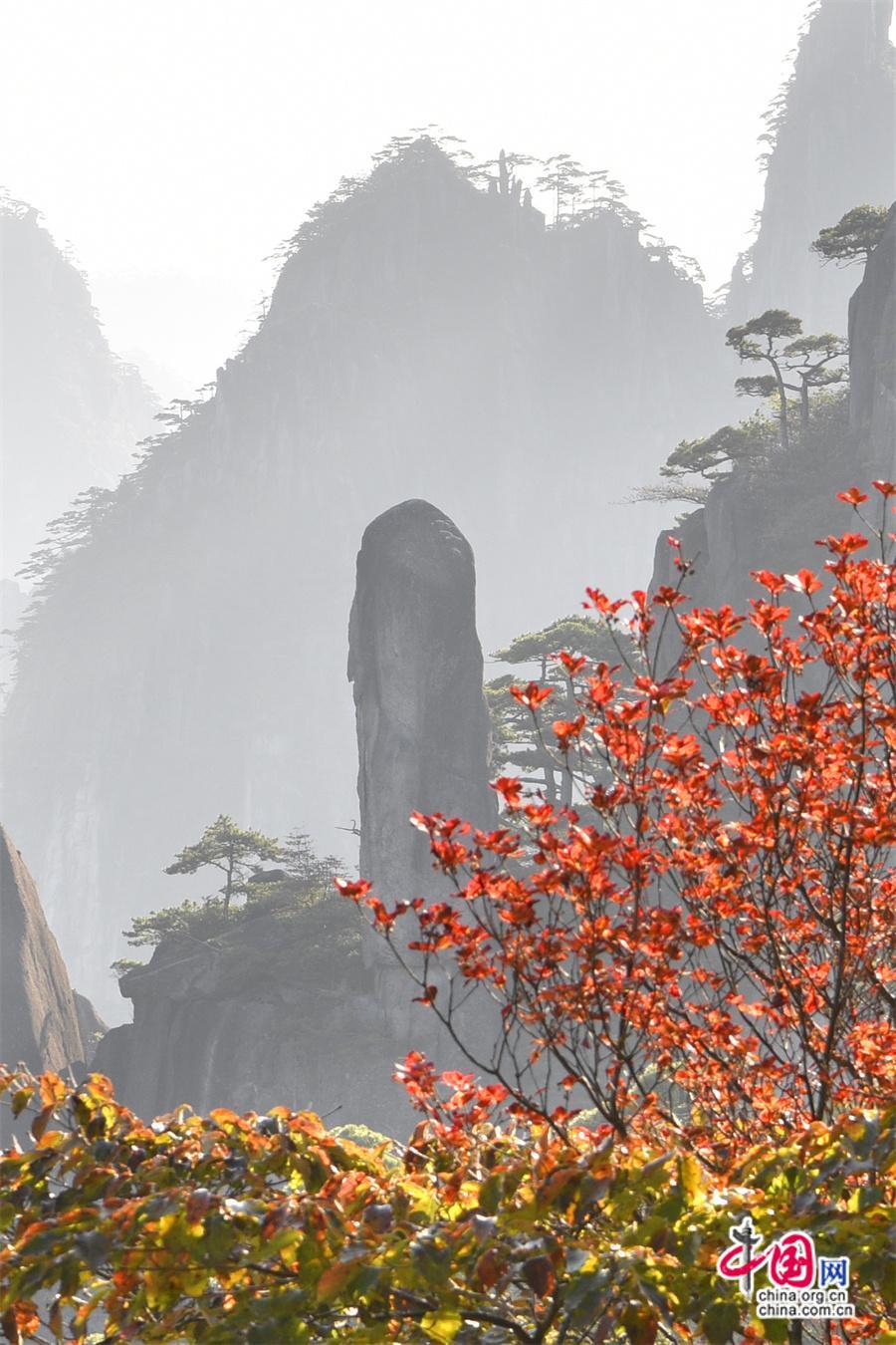 秋日黃山,雨后放晴最為嫵媚。蔚藍(lán)色的天空一塵不染,山間綿連不斷的云海,時而像海浪在空中翻滾,擁擠著、碰撞著,時而像一匹白紗綢緞,環(huán)繞在山巔上、飄散在松林間,只見黃山的紅葉點(diǎn)點(diǎn)散落,紅綠相間,與峻峭山峰、藍(lán)天云海、奇松怪石,精致婉約地繪成一幅幅五顏六色的山林畫卷,正是登游好時節(jié)。(姚育青)