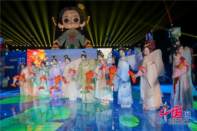 水鄉(xiāng)錦鯉,有福有喜,錦鯉飛魚秀徜徉在舞臺與燈組之間。