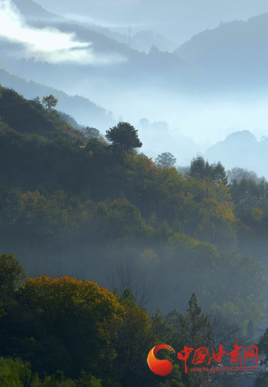 進(jìn)入十月,康縣的秋景漸入佳境,秋日的暖陽(yáng)透過(guò)薄霧灑在五彩斑斕的山脊上,滿山層林盡染、渾然一體,好似一幅油彩畫(huà)。