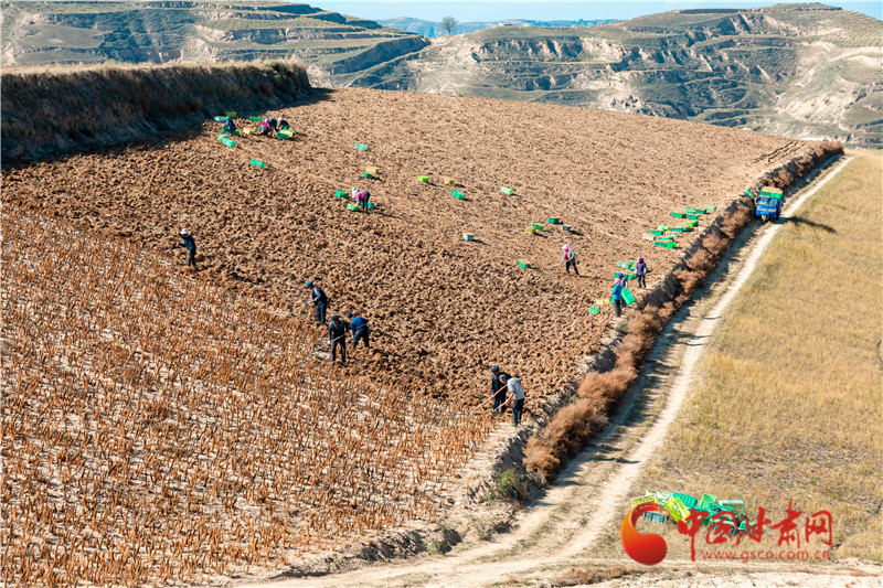 同樣在榆中縣園子岔鄉(xiāng),連片的田間地頭里,農(nóng)民們干勁十足,臉上洋溢著豐收的喜悅。隨著鋤頭的翻挖,一顆顆個大飽滿的百合破土而出,構成了一幅繁忙的秋收畫卷。