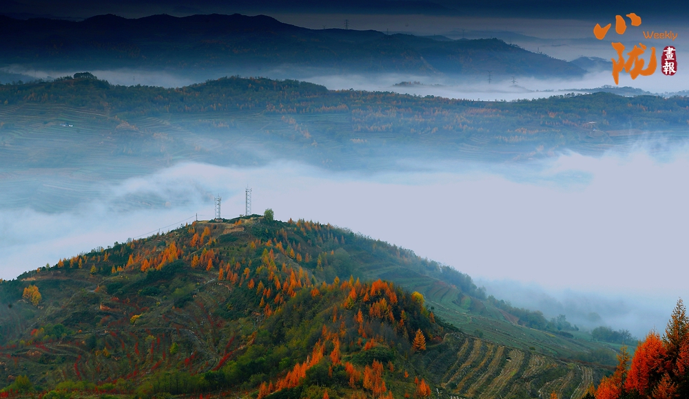 天空中布滿了烏云,云隙中的陽(yáng)光和從四面八方漫過(guò)來(lái)的云霧、滿山彩林,把云華山點(diǎn)綴得像一幅筆墨清爽、疏密有致山水畫(huà)。