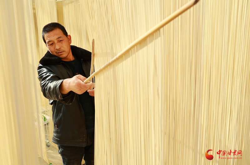 近日,在甘肅省隴南市康縣周家壩鎮(zhèn)周家壩村,村民周珍珍家正在抓住晴好天氣制作傳統(tǒng)純手工掛面,供應年貨市場。