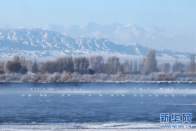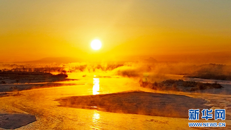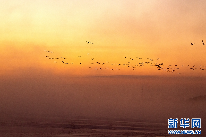 1月21日,冬日清晨,甘肅張掖黑河濕地日出如畫。一輪冉冉升起的紅日絢麗奪目,與河流、樹木、候鳥、晨霧共同構成了一幅生態(tài)畫卷。新華網(wǎng)發(fā)(成林 攝)