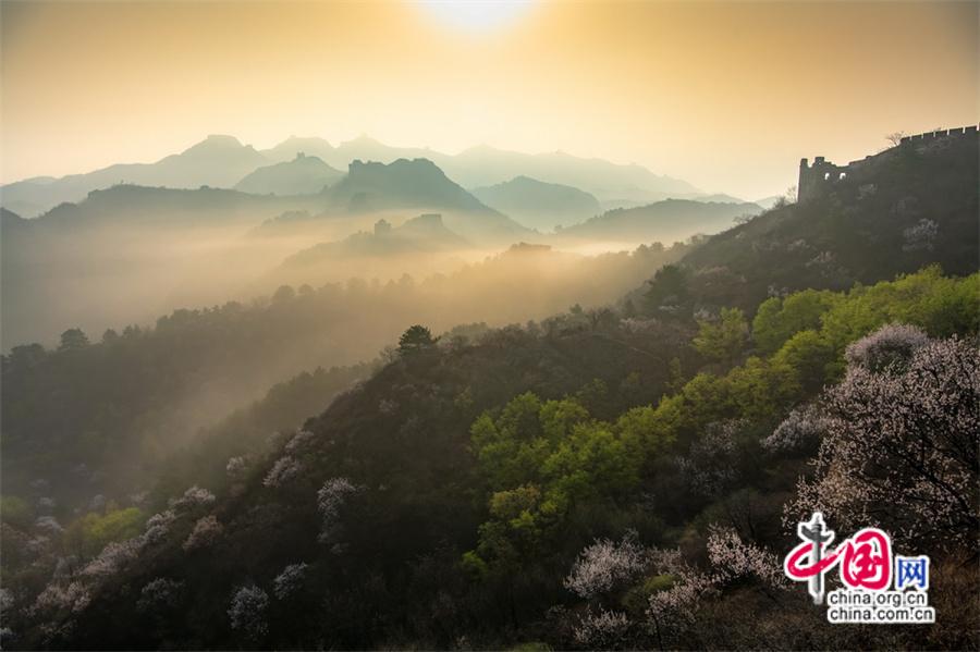 四月長(zhǎng)城壯觀云海驚艷 金山嶺杏花共舞春風(fēng)