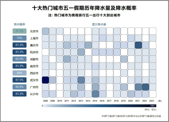 需要特別提醒的是,熱門(mén)城市中的廣州市雖然歷年降水量并不是特別大,但今年“五一”期間,華南地區(qū)還會(huì)延續(xù)前期雨水偏多的節(jié)奏,在五天假期的后半段將出現(xiàn)暴雨至大暴雨,去往廣州及周邊等地旅行,需及時(shí)關(guān)注當(dāng)?shù)貧庀蟛块T(mén)發(fā)布的預(yù)報(bào)預(yù)警,提前安排行程。