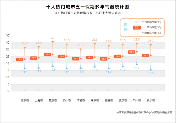 南北方熱門(mén)城市“五一”假期的氣溫差異并不大,都非常適宜出行,最高氣溫均在25℃以上。重慶是唯一一個(gè)在“五一”期間平均最高氣溫達(dá)到30℃的熱門(mén)城市,熱度與溫度都在高位,前往還需注意防暑降溫。