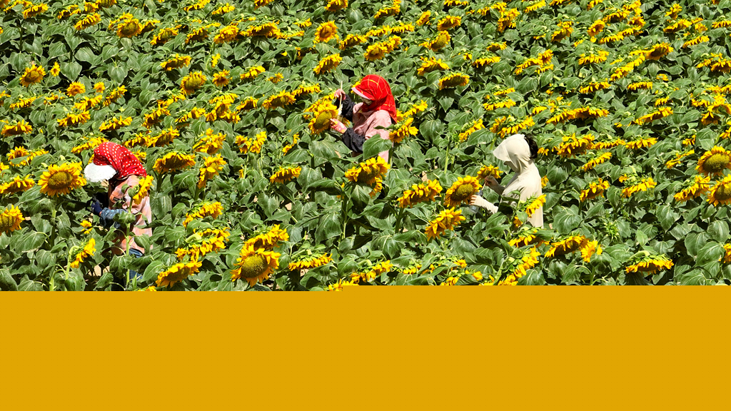 7月5日,甘肅省張掖市高臺縣黑泉鎮(zhèn)北部灘向日葵種植基地里,1000多畝向日葵競相綻放,種植農戶們正在為向日葵采粉、授粉。與此同時,眾多游客紛至沓來,感受美麗的向日葵花海。