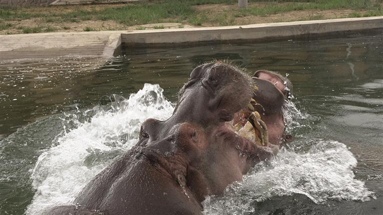 “小乖”今年正值青春活潑的年紀,性格溫順可愛。經(jīng)過一段時間的精心準備與適應(yīng)期,“小乖”已經(jīng)與老住戶“大嘴”和諧相處,一同在水中暢游、嬉戲玩耍,或是在岸邊悠閑進食、曬著太陽。兩只河馬的互動與陪伴,給園區(qū)增加了許多樂趣,也給游客們帶來更加新奇、歡樂的觀賞體驗。