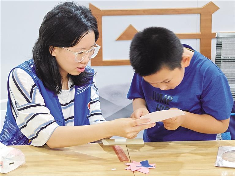 這個夏天,來自天津工藝美術(shù)學(xué)院的大二學(xué)生張如晉玄又一次穿上藍(lán)馬甲,成為了蘭州小草愛心社會工作服務(wù)中心的一名社工。在鹽場路街道的暑期愛心托管班,每天早上8點(diǎn)半,她便準(zhǔn)時到達(dá)工作地點(diǎn),等待著家長將一只只“小神獸”送來托管。從早上的輔導(dǎo)暑假作業(yè),中午看著孩子們用餐、午睡,再到下午主題豐富的興趣小課堂,張如晉玄和同事們不僅解除家長暑期的后顧之憂,也讓孩子們度過一個紛紛多彩的假期。