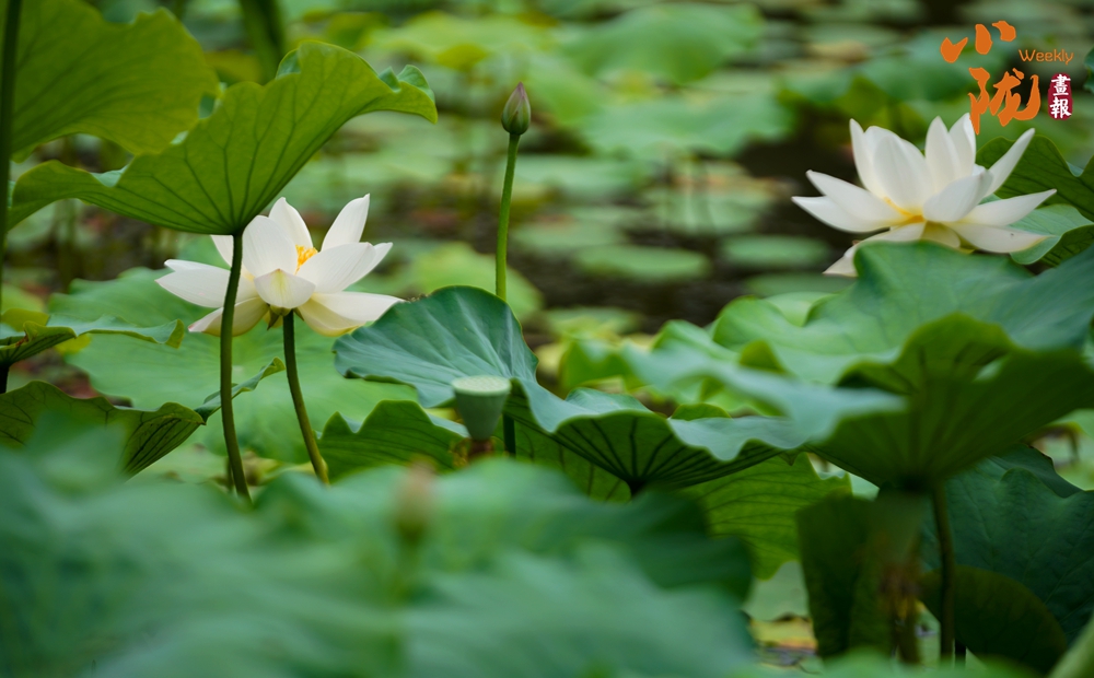 一朵朵、一簇簇、白色的荷花星星點點、清美動人點綴于成片的翠綠色荷葉間或肆意怒放,或含苞待放形成一幅美麗的生態(tài)畫卷。