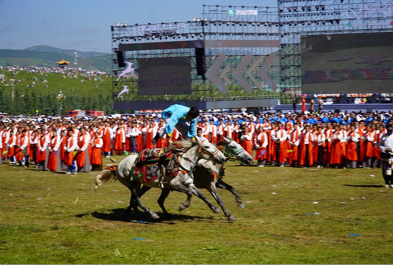 草原騎手乘著矯健的駿馬高舉著鮮艷的五星紅旗從主席臺前奔馳而過,讓在場的數(shù)萬觀眾贊嘆不已,呈現(xiàn)出一個(gè)絢麗多彩的甘南、和諧穩(wěn)定的甘南、朝氣蓬勃的甘南、包容開放的甘南、團(tuán)結(jié)奮進(jìn)的甘南。