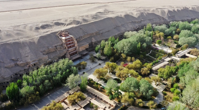 敦煌莫高窟窟區(qū)(無人機照片)。記者 陳斌 攝