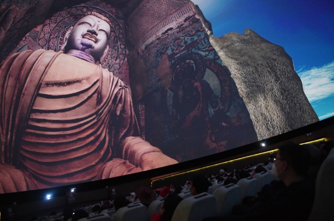 游客在莫高窟數(shù)字展示中心觀看球幕電影《夢幻佛宮》。記者 陳斌 攝