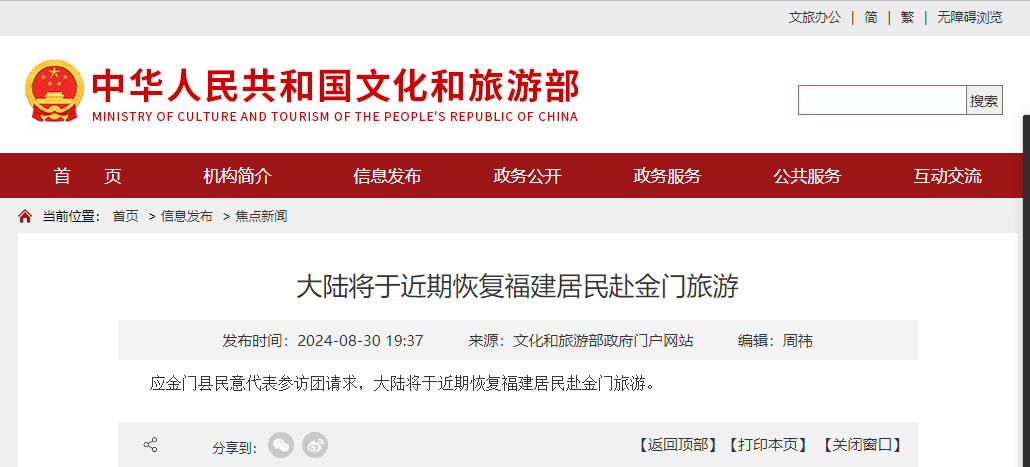 原標題:文旅部:大陸將于近期恢復福建居民赴金門旅游
