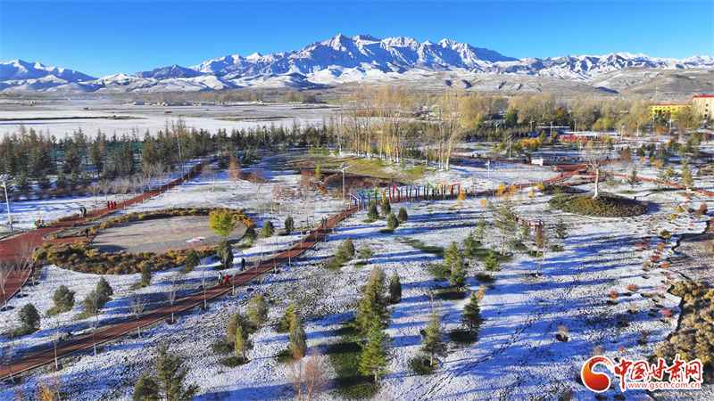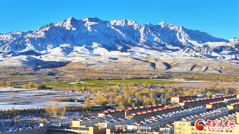 10月22日,雪后初晴的張掖市民樂縣,連綿起伏的祁連山被皚皚白雪覆蓋,整個縣城一片銀裝素裹,在晨曦的照射下,呈現出一幅多姿多彩、生態(tài)和諧的美麗畫卷。