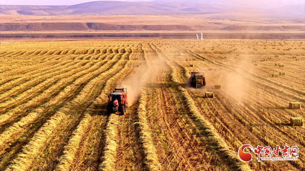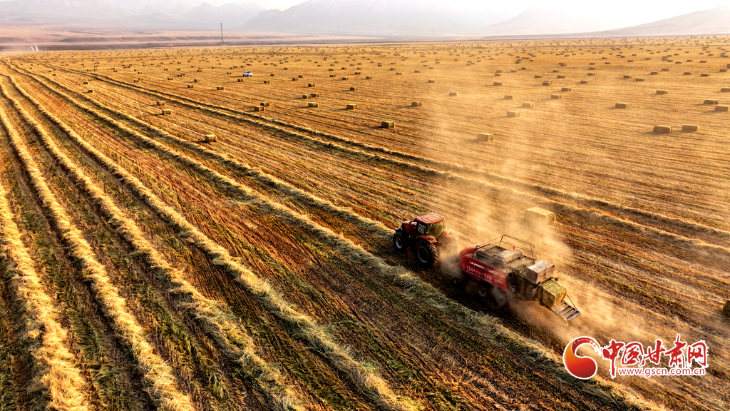 11月11日,甘肅山丹馬場的10萬畝燕麥草進(jìn)入打包高峰期,田野上呈現(xiàn)出一派繁忙而有序的景象。放眼田間,大型農(nóng)用機(jī)械來回穿梭,將燕麥草迅速壓縮、打包,一個個草捆整齊排列。與此同時(shí),滿載草捆的運(yùn)輸車在田間小道上來回奔波,將成品送往倉庫和銷售地。