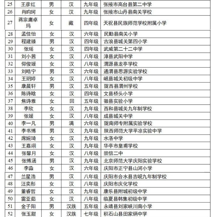 日前,經(jīng)地方各級教育行政部門推薦,第十六屆宋慶齡獎學金獲獎名單公布,全國共有1542名學生獲獎,其中甘肅56人。