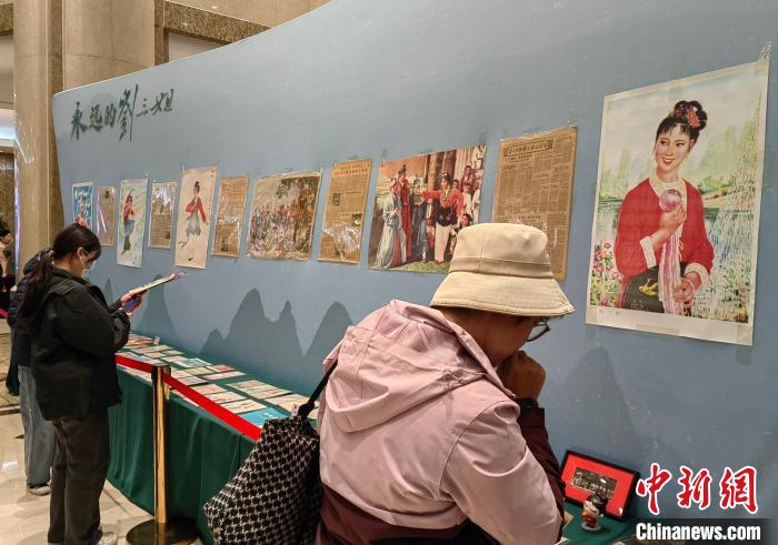 “永遠(yuǎn)的劉三姐”小型展覽18日晚也在長安大戲院展出,各種版本《劉三姐》的劇本、歌本、歌片、節(jié)目單,與劉三姐相關(guān)的各種海報(bào)、唱片、郵品和老報(bào)紙等展品吸引觀眾紛紛駐足。