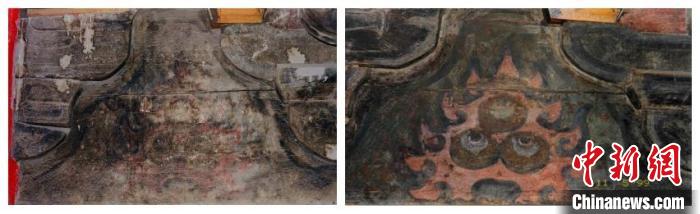 圖為1999年拍攝的長樂門內(nèi)檐彩畫顏料層顯色加固前后對比。(陜西師范大學(xué)歷史文化遺產(chǎn)保護(hù)教育部工程研究中心供圖)