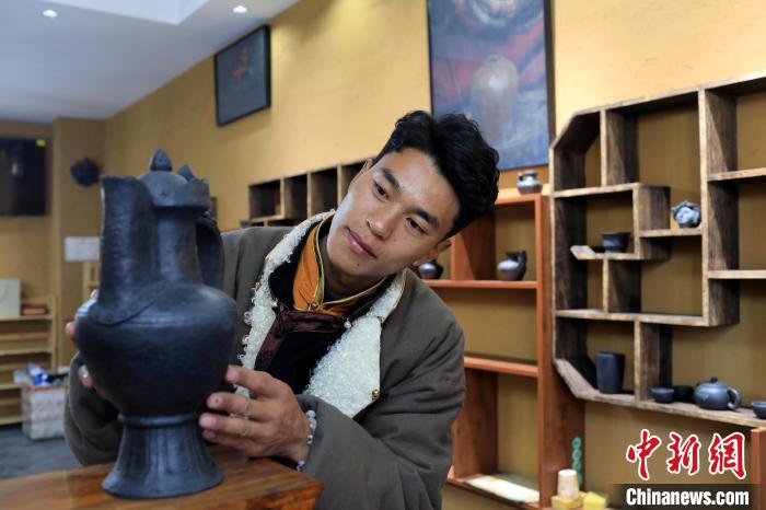 12月22日,在勒通古鎮(zhèn)的一家陶藝館內(nèi),陶藝師土登擺放土陶作品。中新社記者 王磊 攝