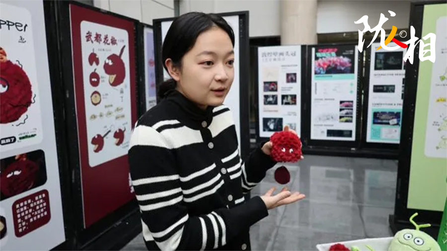 她拿起一只文創(chuàng)玩偶,輕輕拉起玩偶頂部蜷縮的細柄,這只紫紅色、毛茸茸的花椒玩偶立刻“嗡嗡”震動起來?;ń肺队X上的麻就這樣傳遞到手上,精妙的構(gòu)思,令大家會心一笑。