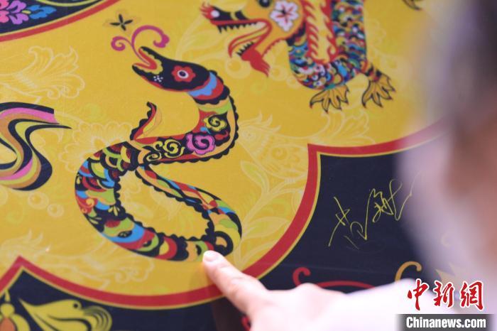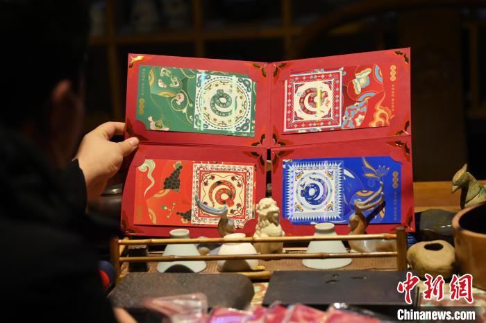 1月10日,在甘肅省敦煌市敦煌畫院內(nèi),游人參觀由敦煌畫院設(shè)計授權(quán)的中國郵政《敦煌福蛇》極限型明信片。中國郵政《敦煌福蛇》極限型明信片從敦煌壁畫里的藻井汲取靈感,集合敦煌紋樣、民藝剪紙等中國傳統(tǒng)藝術(shù)內(nèi)容,以春萌蛇、夏長蛇、秋實蛇、冬藏蛇對應(yīng)著四季祝福。中新社記者 李亞龍 攝