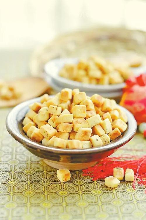 做面棋子,先和面。面里最好加豬油、雞蛋,攪拌均勻,加水,再揉,揉好面,搟開。不能太薄,也不能太厚,約半本語文書那般寬度即可。然后切,切成菱形,拇指大小,撒面,一拌,以防粘連。麥草燒鍋,鍋熱,放油。油熱,冒微煙,把面棋子放進(jìn)鍋,反復(fù)翻炒,直到微黃。炒熟后,熄火,不蓋鍋蓋,再到鍋里“焙”(烤的意思)一陣,直到用勺子舀起,又倒下去,鐵鍋里叮當(dāng)有聲即可。
