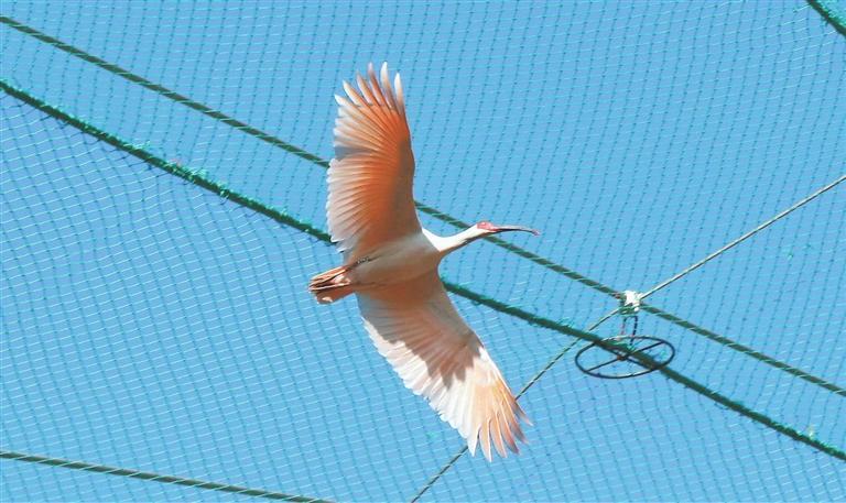 小隴山龍門林場(chǎng)朱鹮生態(tài)園中展翅翱翔的朱鹮。