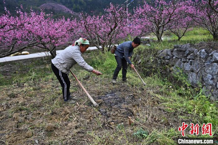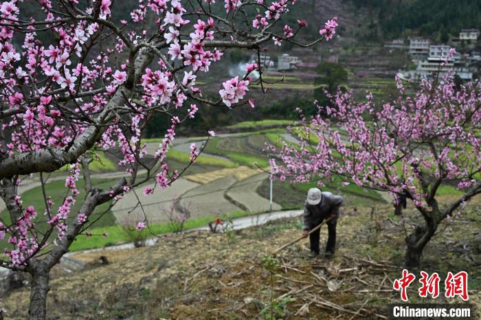 3月15日,在廣西田林縣浪平鎮(zhèn)浪平村,村民在桃樹(shù)下勞作。黃數(shù)情 攝