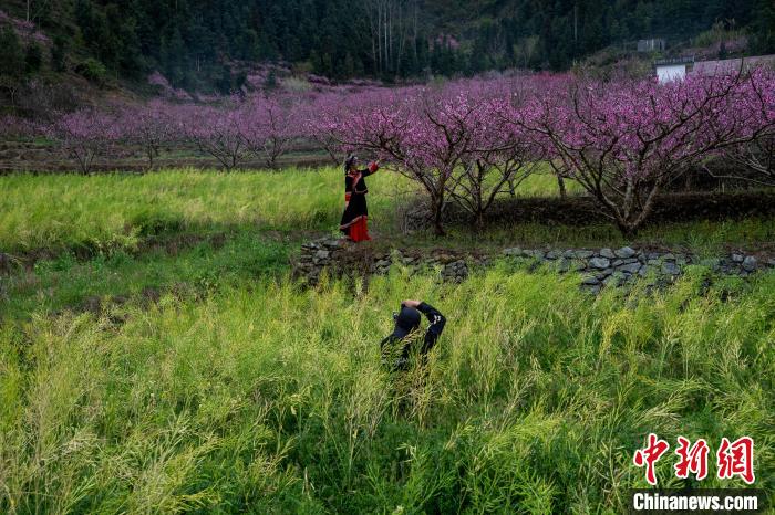 時(shí)下正是桃花盛開(kāi)的時(shí)節(jié),在廣西田林縣浪平鎮(zhèn)浪平村,村民種植的桃花競(jìng)相綻放。滿(mǎn)樹(shù)繁花與錯(cuò)落村舍相互映襯,還有樹(shù)旁玩耍的孩童、樹(shù)下勞作的村民,動(dòng)靜交織,構(gòu)成一幅絕美的田園春景圖。圖為3月15日,在廣西田林縣浪平鎮(zhèn)浪平村,村民在桃樹(shù)下勞作。黃數(shù)情 攝