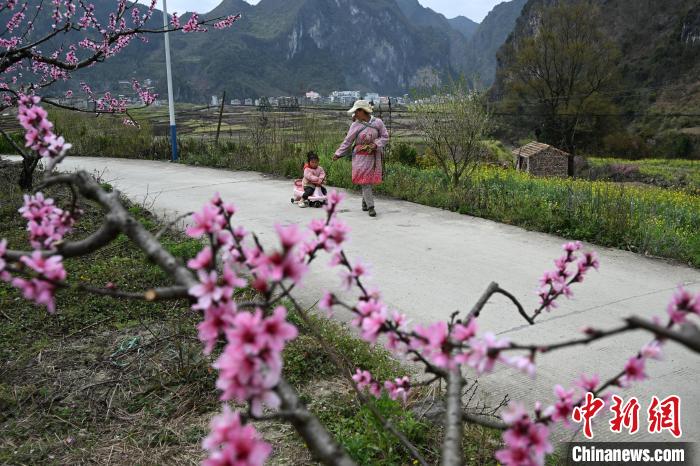 3月15日,在廣西田林縣浪平鎮(zhèn)浪平村,村民在桃樹(shù)旁走過(guò)。黃數(shù)情 攝
