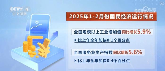 數(shù)據(jù)顯示,2025年1—2月份,工業(yè)生產(chǎn)較快增長,全國規(guī)模以上工業(yè)增加值同比增長5.9%,比上年全年加快0.1個百分點(diǎn)。服務(wù)業(yè)增勢較好,全國服務(wù)業(yè)生產(chǎn)指數(shù)同比增長5.6%,比上年全年加快0.4個百分點(diǎn)。市場銷售增長加快,社會消費(fèi)品零售總額83731億元,同比增長4.0%,比上年全年加快0.5個百分點(diǎn)。