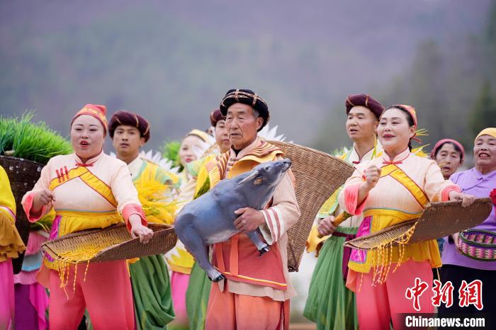 依托黎壩鎮(zhèn)層疊梯田的天然弧度與蒼翠山谷的立體聲場,該劇將鎮(zhèn)巴民歌、陜南民俗等非遺元素融入山水實(shí)景。春之序曲《山歌迎賓》中,油菜花海間百人山歌陣,以原生態(tài)多聲部民歌編織迎賓盛景;夏之華章《綠的交響》里,非遺薅草鑼鼓與現(xiàn)代音樂碰撞出農(nóng)耕文明的力與美;秋之禮贊《金的節(jié)奏》在陽光下呈現(xiàn)打連枷聲浪與稻浪共舞的豐收奇景;冬之情書《紅的濃情》則通過圍爐陜南說唱,在吊爐光影間訴說巴山兒女的熾熱情懷。