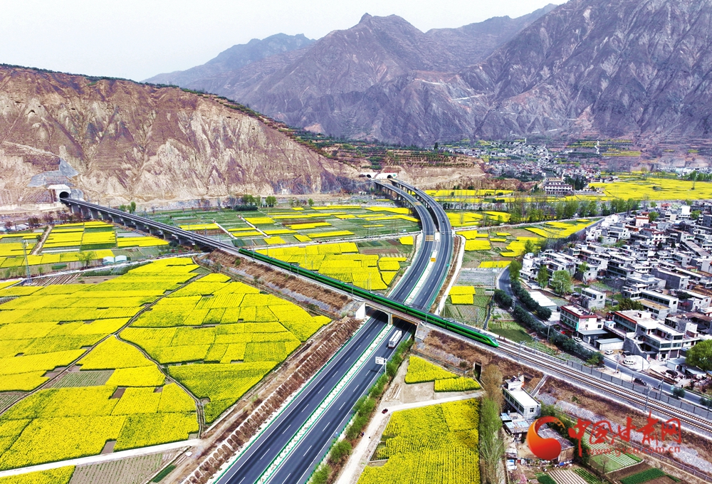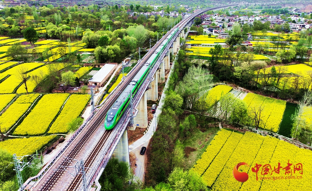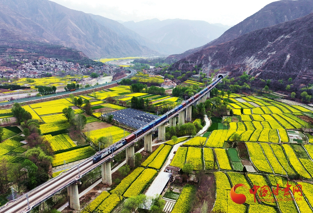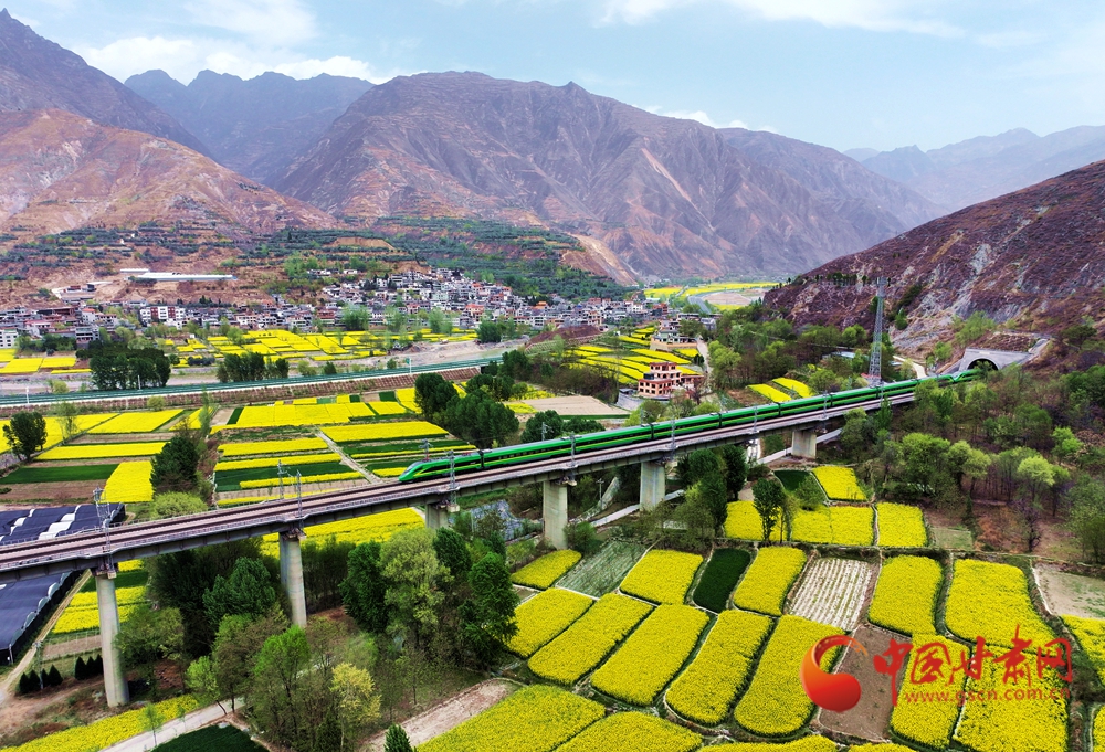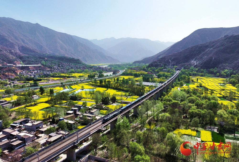 4月10日,列車在蘭渝鐵路宕昌縣沙灣鎮(zhèn)段附近行駛,穿行于花海之間?,F(xiàn)代交通動脈與原始鄉(xiāng)野在此默契共生,火車轟隆駛過,為春日畫卷增添了別樣的景致。