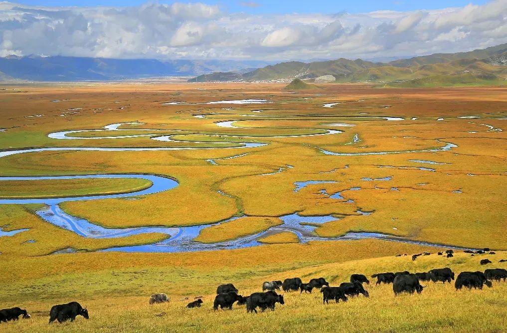 牦牛群如黑珍珠般散落于天際