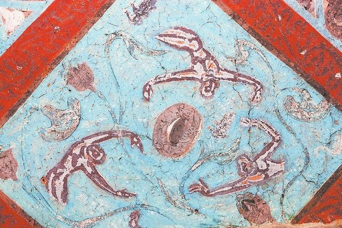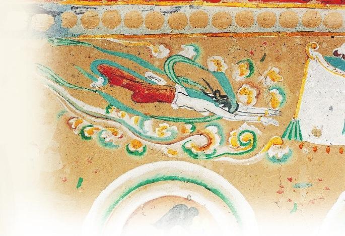 在許多人的認知里,飛天是唯美曼妙的化身。在敦煌的許多壁畫中有大量的飛天形象,但是你知道嗎?在這些壁畫中除了凌空飛躍的飛天外,還有不少水中的飛天。在莫高窟第329窟壁畫中有一幅“潛水式飛天圖”:畫面中的一位飛天身著赭紅色長裙,藍色飄帶纏身,雙手伸展前伸,似乎正在水中遨游。畫面唯美而靈動,在曼妙中透著健碩,使人過目難忘。