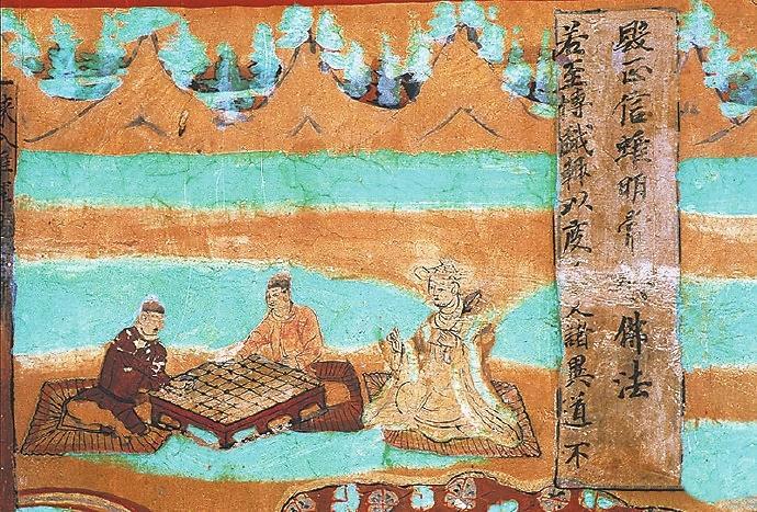 在敦煌壁畫中有關對弈的內容較多。在莫高窟第454窟、第7窟壁畫中都有“弈棋圖”。兩幅圖的畫面有不少類似的地方:一是畫師較為突出棋盤的位置,兩幅壁畫中的棋盤都居中且形制相對巨大;二是畫面上的人物均為三人,兩人對弈,一人觀戰(zhàn),“觀棋不語真君子”;三是對弈者身后的景色都是天朗氣清、遠山含黛。據(jù)說,一天,北宋大文豪蘇東坡與摯友黃庭堅正在松樹底下弈棋。一陣風吹來,松果掉進棋盤。蘇東坡隨即吟道:“松下圍棋,松子每隨棋子落。”黃庭堅馬上回答道:“柳邊垂釣,柳絲常伴釣絲懸。”雅趣十足。其實,棋局里的一動一靜、一招一式無不需要謹小慎微、穩(wěn)扎穩(wěn)打。而對弈時的當斷則斷、示假隱真、有效合作等戰(zhàn)術不僅是對弈的智慧,也是人生的哲理吧。