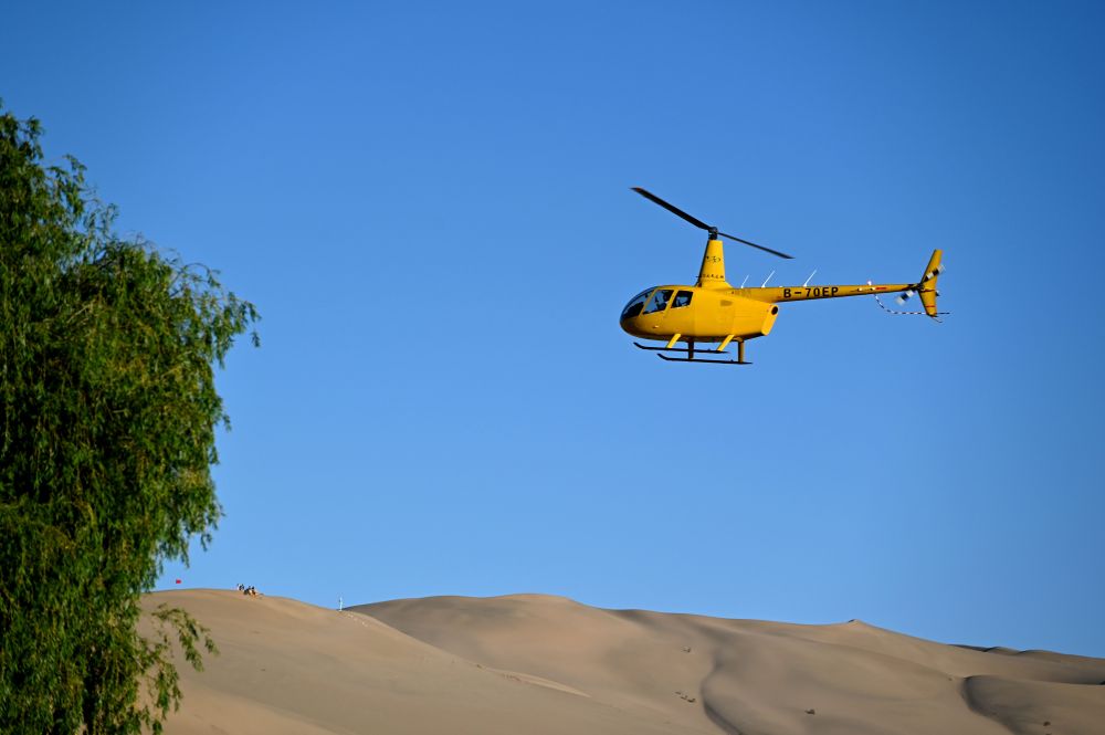 5月24日,在敦煌市鳴沙山月牙泉景區(qū),游客乘坐直升機(jī)從空中欣賞大漠風(fēng)光。新華社發(fā)(張曉亮攝)