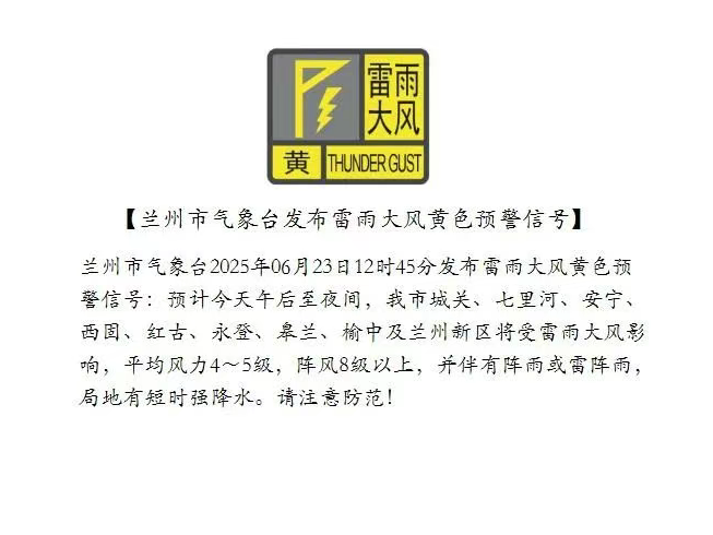 蘭州市氣象臺(tái)2025年06月23日12時(shí)45分發(fā)布雷雨大風(fēng)黃色預(yù)警信號(hào):預(yù)計(jì)今天午后至夜間,我市城關(guān)、七里河、安寧、西固、紅古、永登、皋蘭、榆中及蘭州新區(qū)將受雷雨大風(fēng)影響,平均風(fēng)力4~5級(jí),陣風(fēng)8級(jí)以上,并伴有陣雨或雷陣雨,局地有短時(shí)強(qiáng)降水。請(qǐng)注意防范!